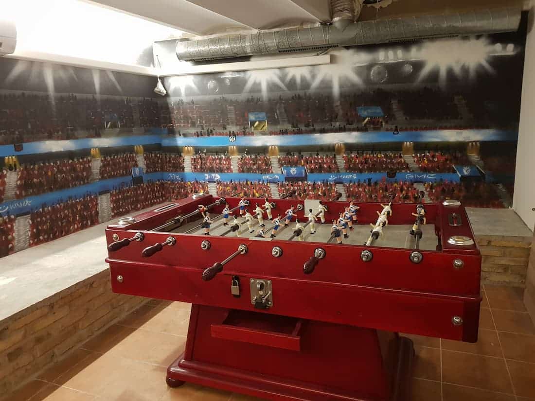 Sociedad Futbolín En una sociedad del casco antiguo de Pamplona, me pidieron tematizar la sala del futbolín. Decidimos simular las gradas del estadio del Sadar. Categoría: Mural para Interior Fecha: agosto 31, 2021